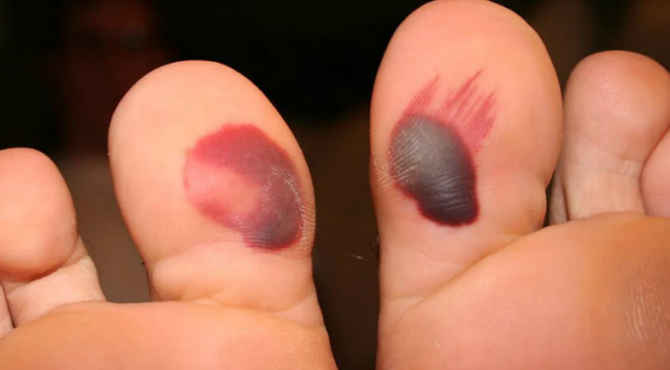 A blood blister forms when shearing force or pressure damages tiny blood vessels (capillaries) in the dermis (the layer beneath