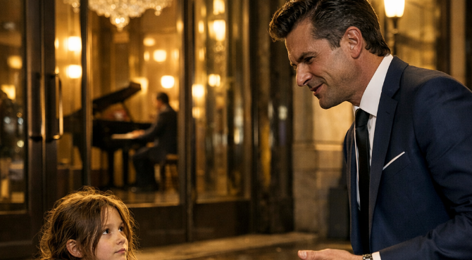 The rain had stopped just minutes earlier, leaving the city sidewalks slick and glowing beneath the evening streetlights. Outside the